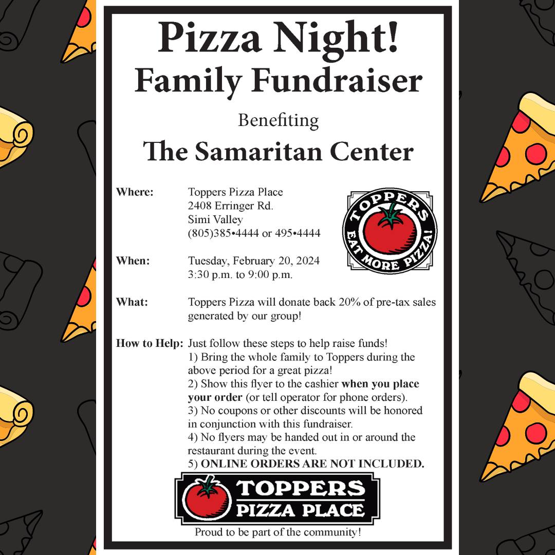Save the date for Pizza Night at Toppers! Tuesday, February 20th 3:30pm - 9:00pm Toppers will donate 20% of your pre-tax purchase to the Samaritan Center! ๐๐๐งก